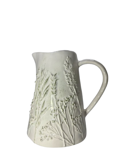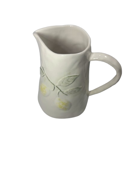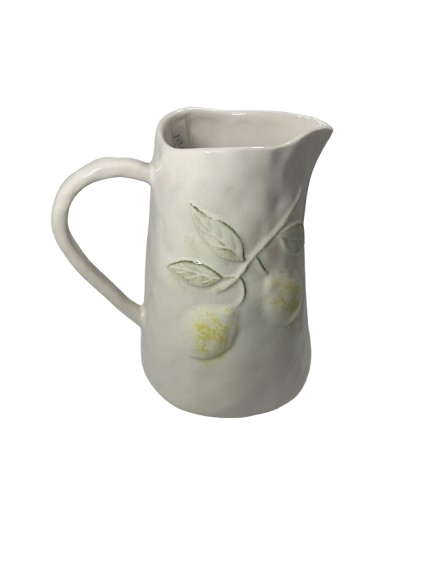 Esta elegante jarra de porcelana presenta un diseño artesanal con relieves de hojas y limones, que le aportan un toque fresco y natural. Su acabado en tonos suaves la hace ideal para complementar cualquier mesa o decoración. Perfecta para servir bebidas o como pieza decorativa, su estilo rústico y delicado se adapta a ambientes contemporáneos y clásicos. Añade encanto y funcionalidad a tu hogar con esta hermosa jarra.