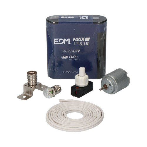 KIT MANUALIDADES EDM CON MOTOR. COMPOSICION: PILA DE PETACA + 1m DE CABLE PARALELO + 1 INTERRUPTOR + 1 PORTALAMPARAS MIGNONNETTE + 1 BOMBILLA 3,6V + 1 MOTOR 1,5-6V