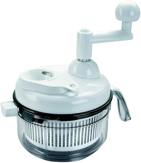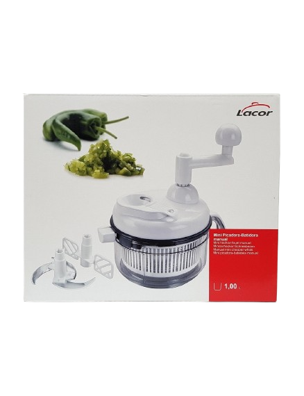 Picadora: Coloque cuidadosamente la cuchilla en el recipiente con el extremo más grande hacia arriba. Colóquela sobre una superficie resistente y gire la manivela. Permite cortar y mezclar varios ingredientes, como hierbas aromáticas, ajo, chile, etc...