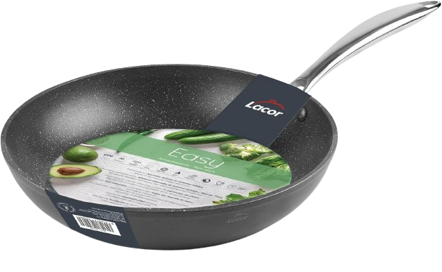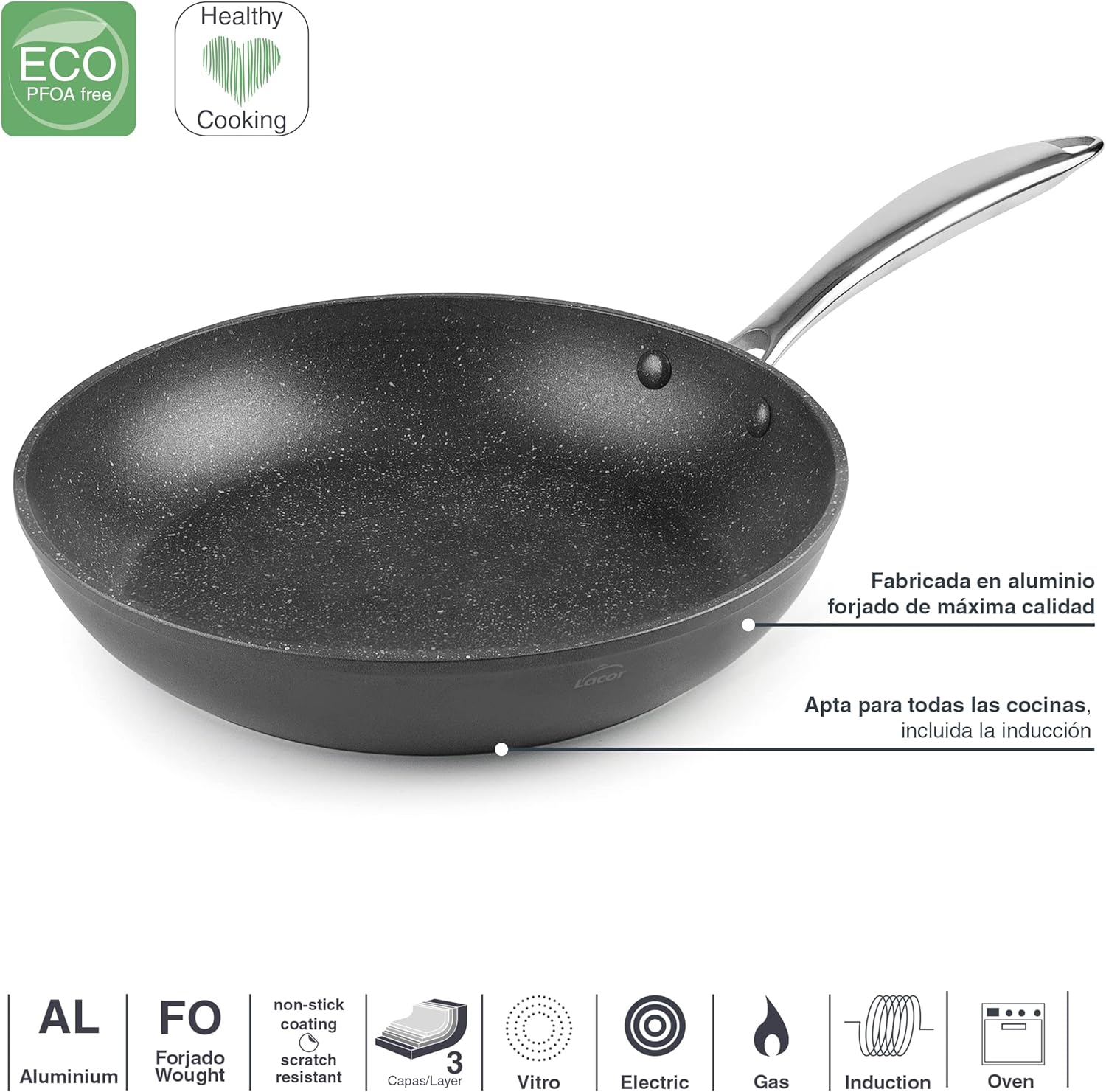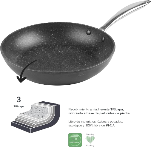 - Sartén con recubrimiento antiadherente TRIcapa, reforzado a base de partículas de piedra. La sartén de Lacor está libre de materiales tóxicos y pesados, ecológico y 100% libre de PFOA.